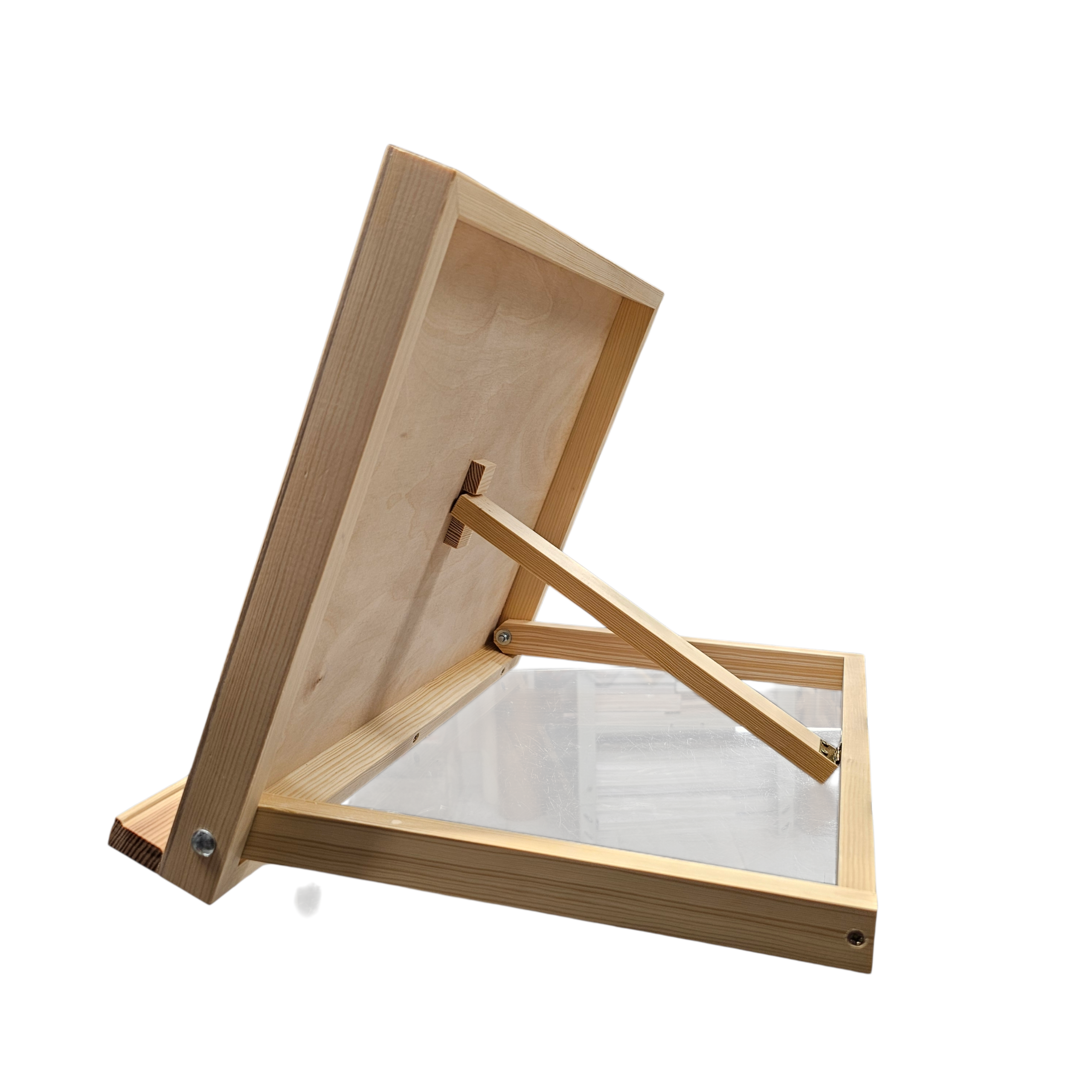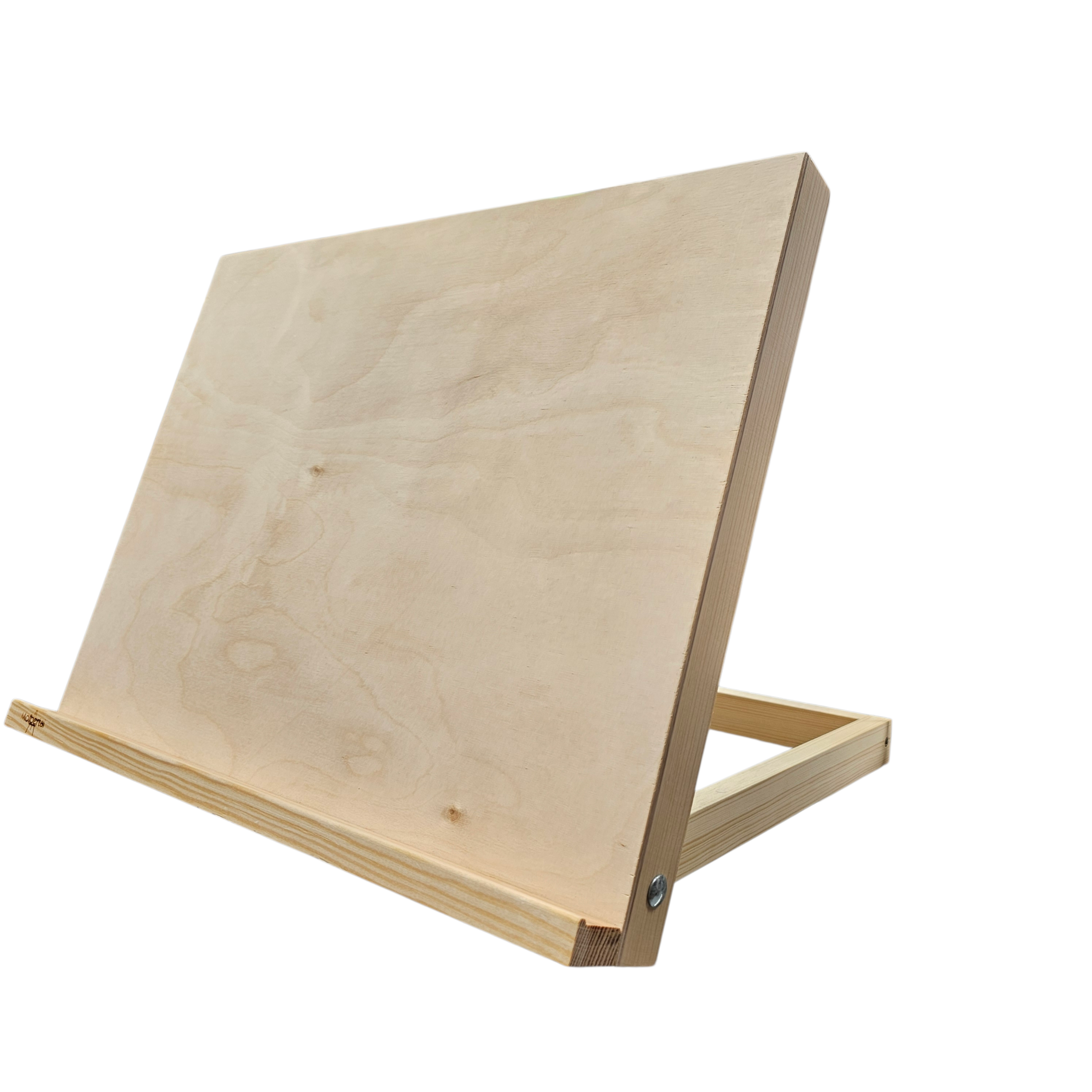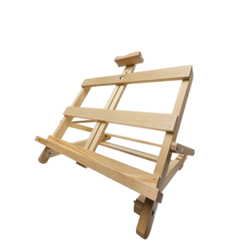 Molbertas pagamintas iš pušies.Galima reguliuoti pasvirimo kampą ir tapomo paveikslo prispaudimo dydį.Patogus trnsporuoti ir nešioti.